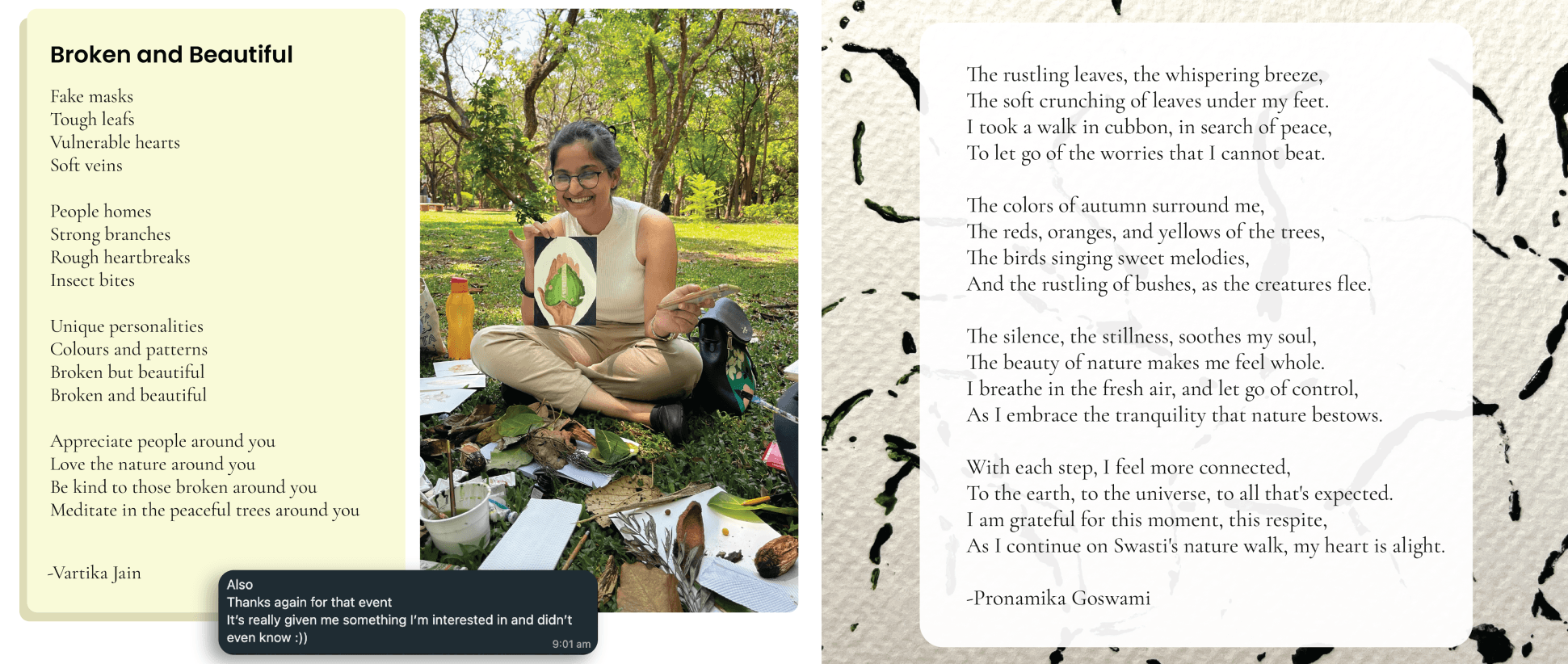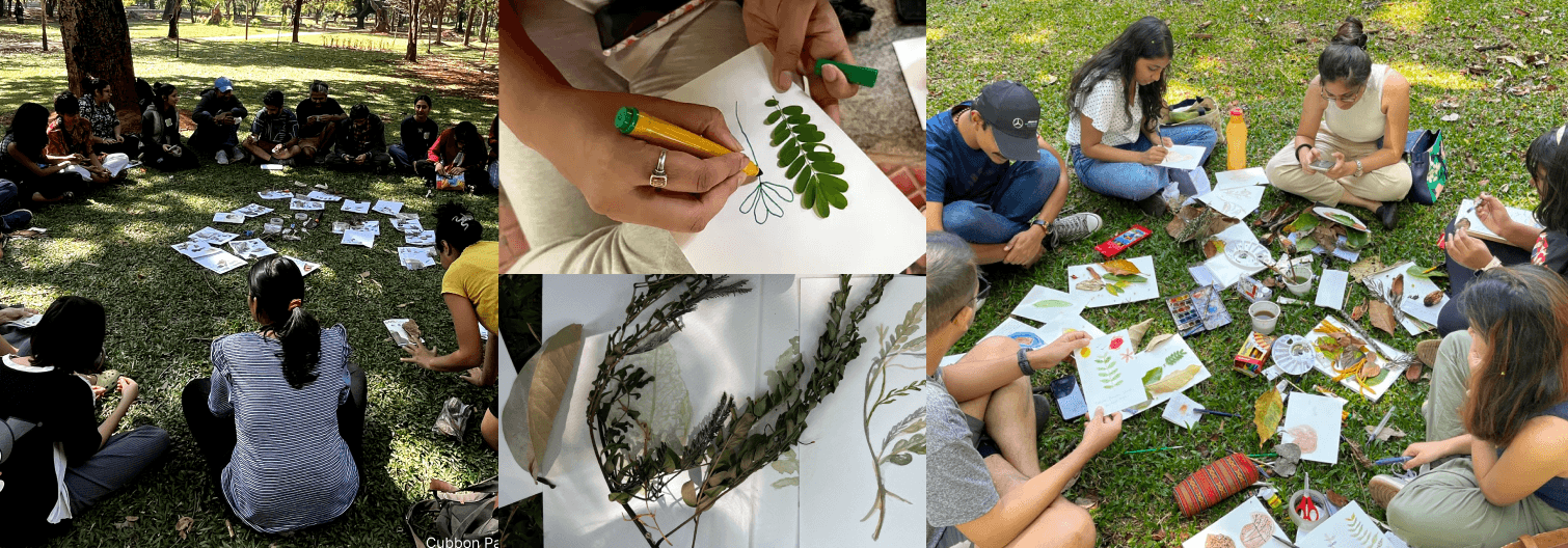 I conducted nature walks at Cubbon Park and Yelahanka, Bangalore. Nature Walks can be an effective way to connect with nature and reignite curiosity. These sessions involved closely observing the surroundings, asking questions, and having friendly conversations. The walks were followed by a painting session to reflect on the walk and artistically record our takeaways.