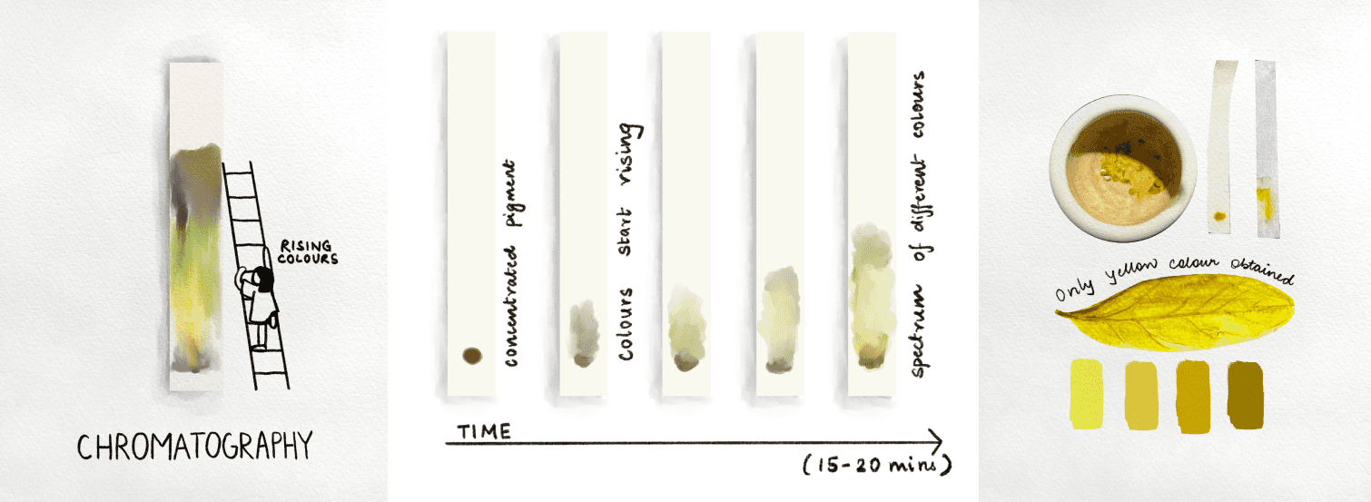 My process was broadly divided into two parts: Scientific exploration and Public engagement. For my scientific process, my primary research was under two categories- paper chromatography and UV light study.